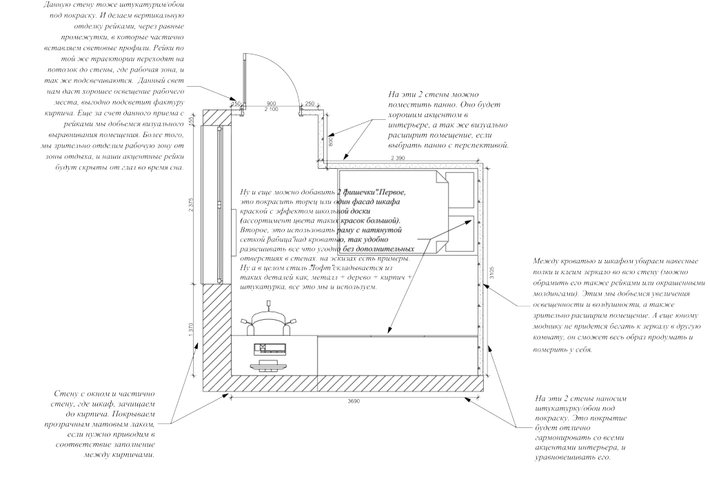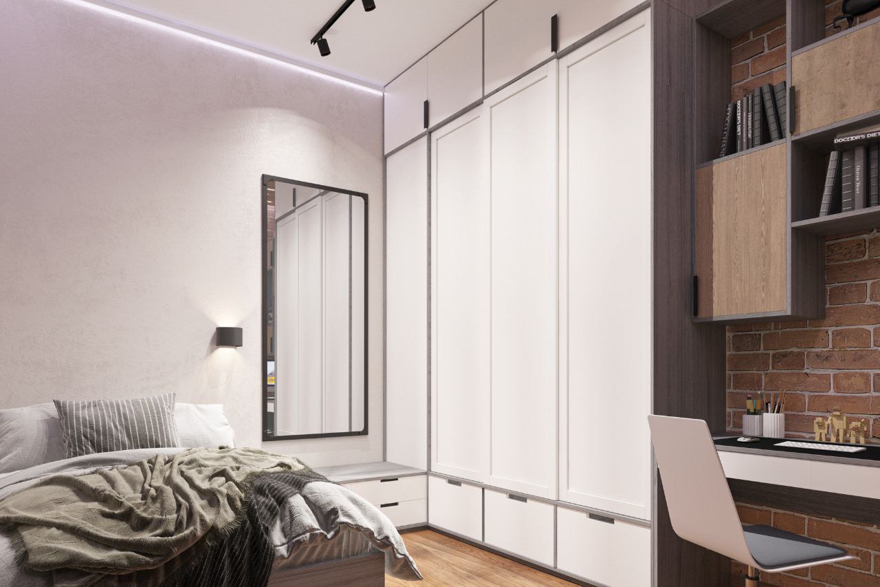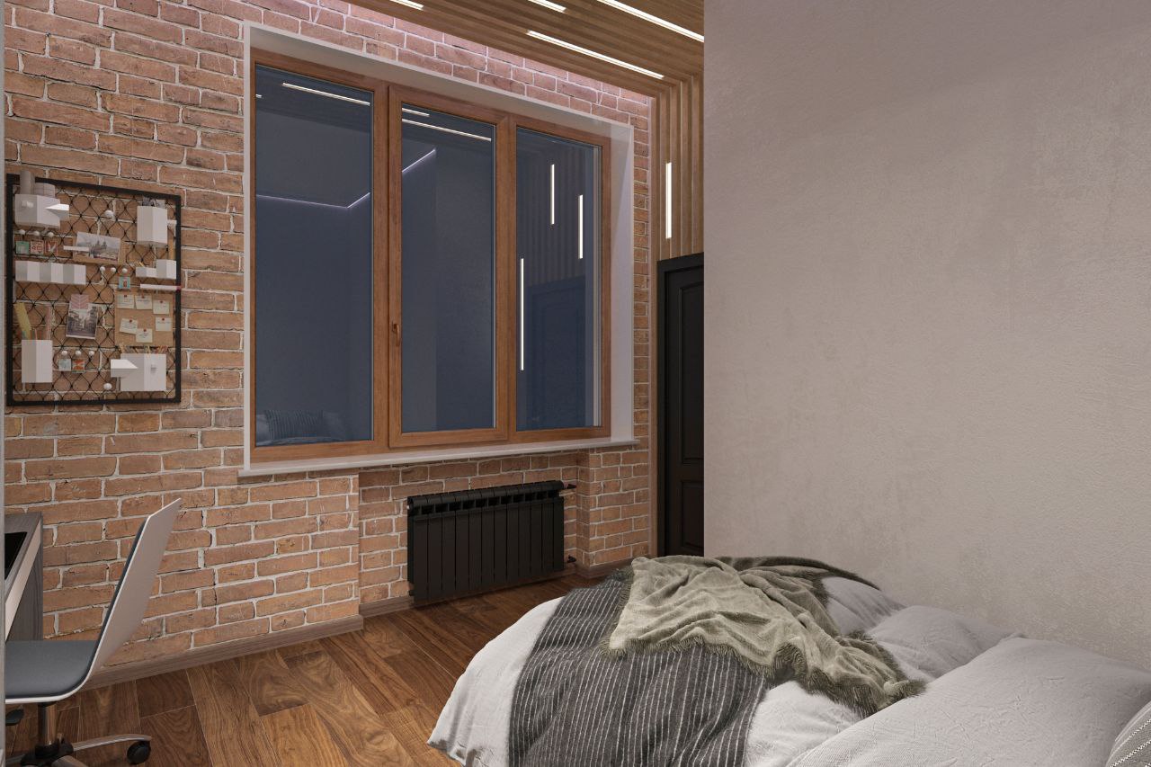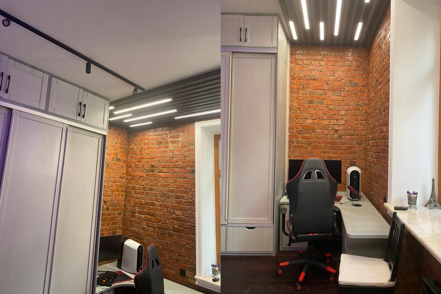 Квартира находится в жилом доме, включенном в перечень культурного наследия г. Москвы, ЦАО. На пороге тринадцатилетия подростки не хотят жить в «детской». Комната 12,5 м² с окном во двор-колодец была перегружена мебелью, люстра с корабликом и карта мира над кроватью отражали стремление родителей к путешествиям. А у подростка было стремление набить татуировки, как у кумира, и сбежать с друзьями в лофт тусить. Поняв задачу, «татуировки кумира» мы нанесли на стену, выдавив их в итальянской штукатурке, а лофт «пришел» к подростку сам, когда мы открыли кирпичную кладку начала ХХ века и подсветили ее светодиодной RGB лентой с пультом управления. Стиль «Неоклассика», 3 функциональные зоны, потолочные рейки с подсветкой и огромное зеркало на противоположной от окна стене - всего за 1 месяц мы до неузнаваемости изменили комнату, угодив и юноше, и Заказчикам.